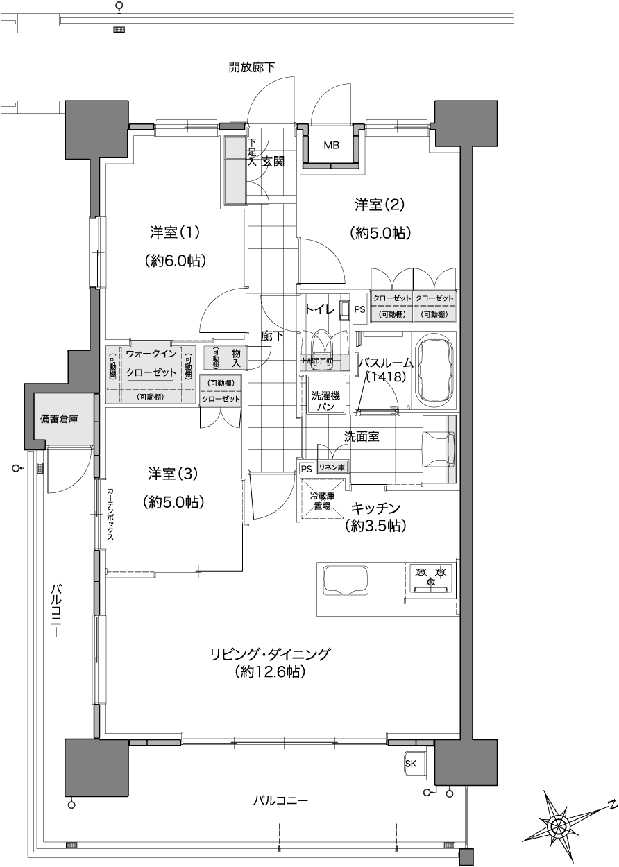 住居専有面積/71.97㎡(21.77坪) バルコニー面積/21.99㎡(6.65坪) MB面積/0.63㎡(0.19坪) 備蓄倉庫面積/1.20㎡(0.36坪)