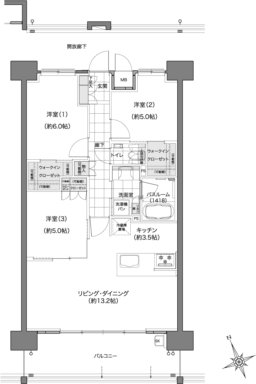 住居専有面積/73.18㎡(22.13坪) バルコニー面積/13.30㎡(4.02坪) MB面積/0.63㎡(0.19坪)