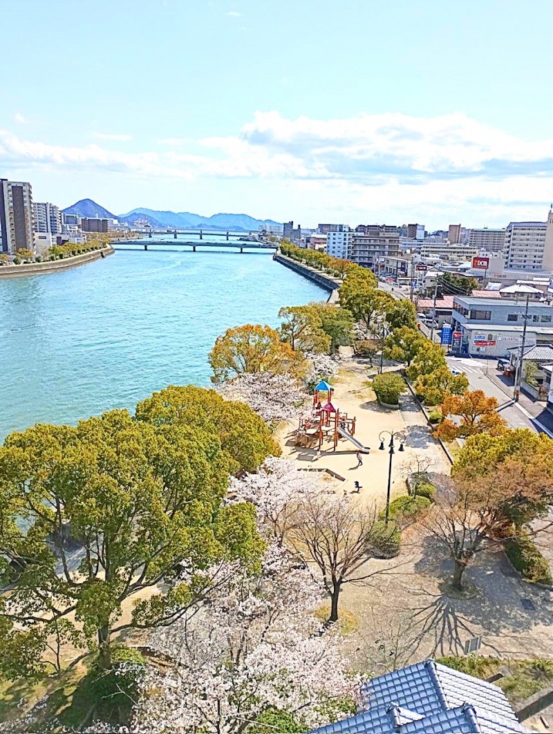 春の眺望です。南側の公園の桜と開放的なリバービューが楽しめます。